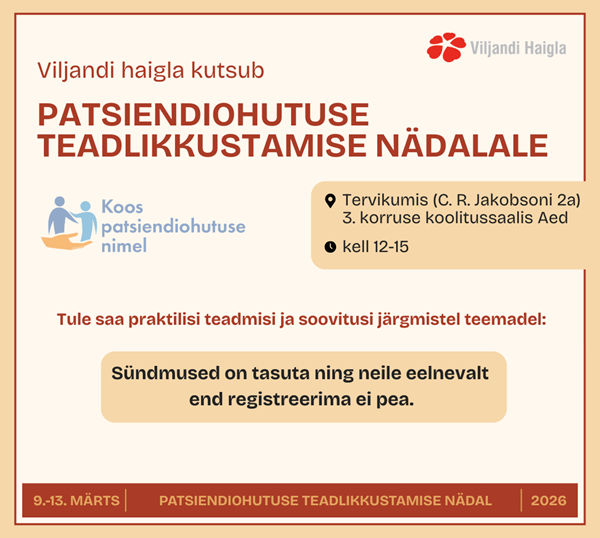 9.–13. märtsil tähistatakse rahvusvaheliselt patsiendiohutuse teadlikkustamise nädalat. Selle raames toimuvad Viljandi haiglas nädala jooksul erinevad tegevused nii patsientidele, lähedastele...