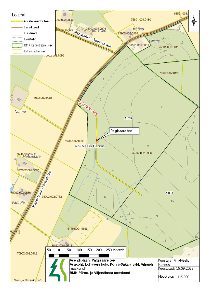 Põhja-Sakala Vallavalitsus avalikustab korralduse eelnõu nr 2-4/36, millega plaanitakse määrata Lõhavere külas asuvale metsateele kohanimi Palgisaare tee ning kanda tee andmed teeregistrisse koos ametliku numbriga 6154015.