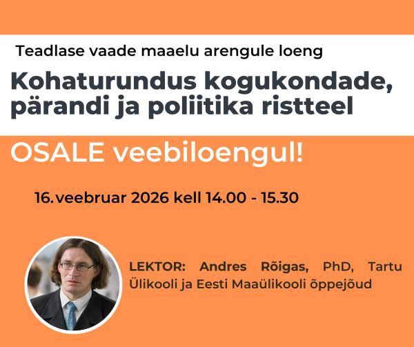 Veebiseminaris „Teadlase vaade maaelu arengule" esineb Andres Rõigas, PhD, kes räägib kohaturundusest kogukondade, pärandi ja poliitika ristteel. Loengus käsitletakse muu hulgas, miks senised regionaalpoliitilised meetmed pole ebavõrdsust piisavalt vähendanud ning millist rolli võivad muutuste käivitamisel mängida kohalik algatus, väärtuspõhine turundus ja sotsiaalne kapital.