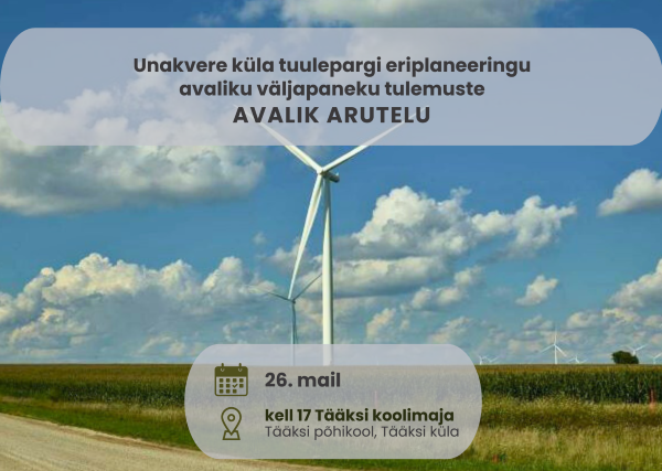 Põhja-Sakala Vallavalitsus korraldab planeerimisseaduse § 107 lg 1 alusel Unakvere küla tuulepargi eriplaneeringu avaliku väljapaneku tulemuste avaliku arutelu 26. mail 2025 algusega kell 17.00 Tääksi koolimajas (Tääksi küla, Tääksi põhikool).