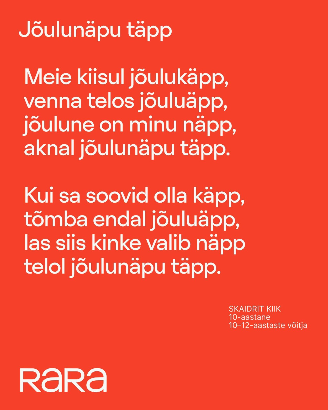 10–12-aastaste vanuserühmas pälvis konkursivõidu Skaidrit Kiik (10), Suure-Jaani kooli 4.a klassi õpilane, kelle luuletus kandis pealkirja „Jõulunäpu täpp".