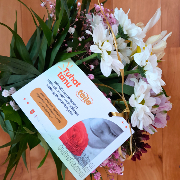 Avafotol lillekimp tänusõnadega meie lasteaia õpetajatele nende pühendumuse ja südamesoojuse eest. FOTO: Luule Tiirmaa