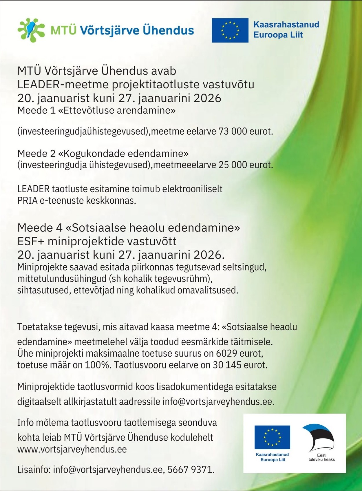 Info: MTÜ Võrtsjärve Ühendus – Taotlusvoor 2026