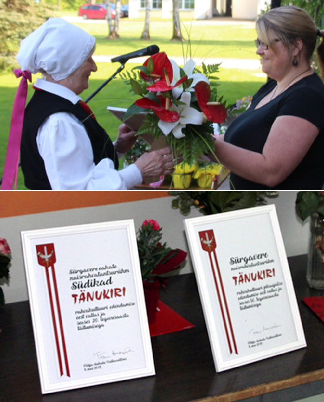 Sürgavere eakate naisrahvatantsurühmale Südikad rahvakultuuri edendamise eest vallas ja seoses 20. tegevusaasta täitumisega;