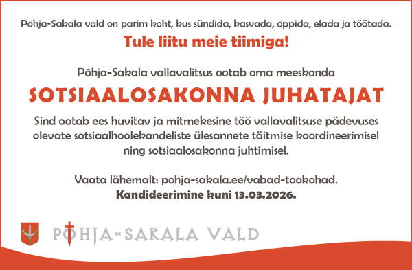Põhja-Sakala Vallavalitsus kuulutab välja konkursi SOTSIAALOSAKONNA JUHATAJA ametikoha täitmiseks. Peamised tööülesanded: sotsiaalosakonna juhtimine, töö planeerimine,...